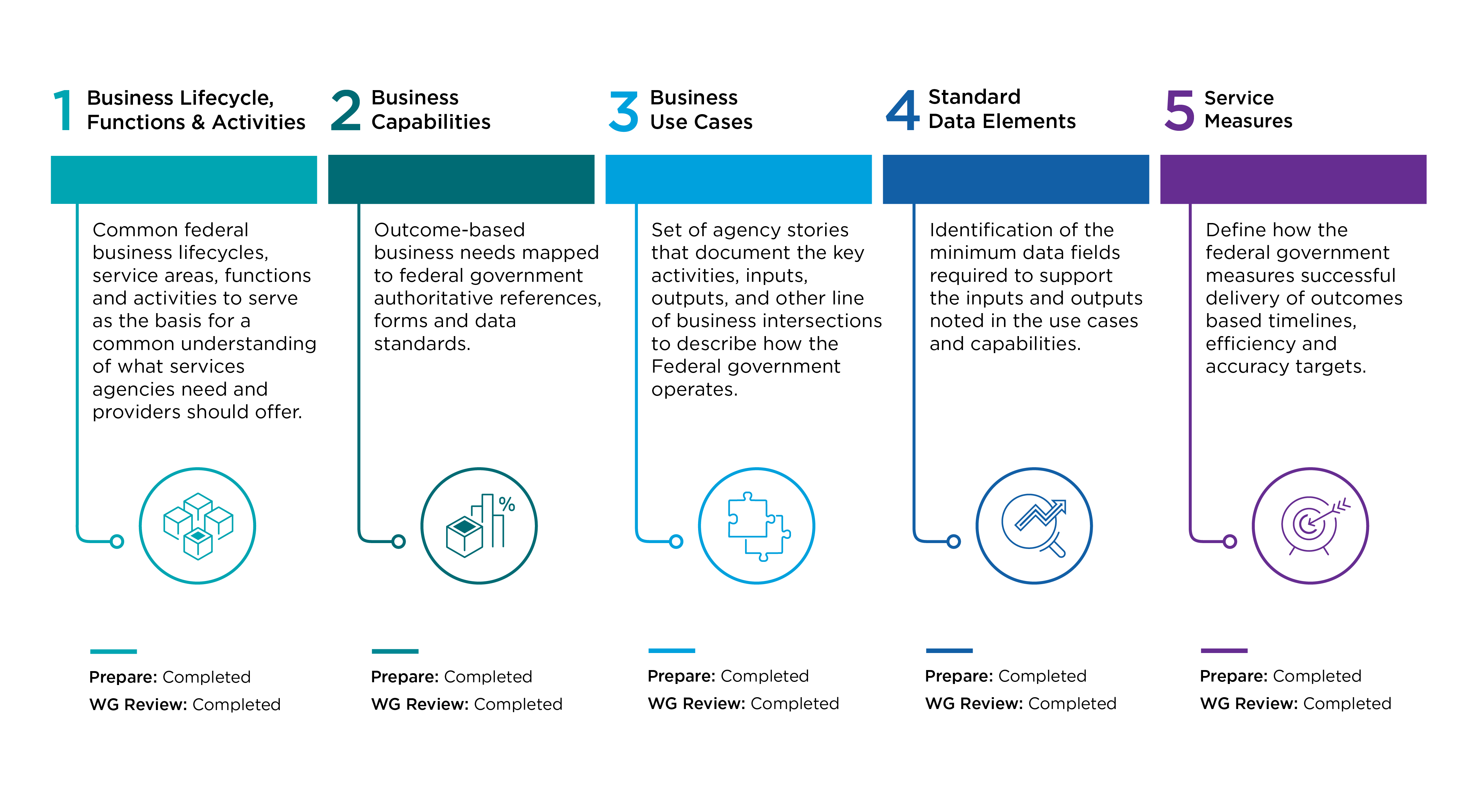 All five ICAM FIBF components are drafted and establish the ICAM baseline for interoperable business and data standards.