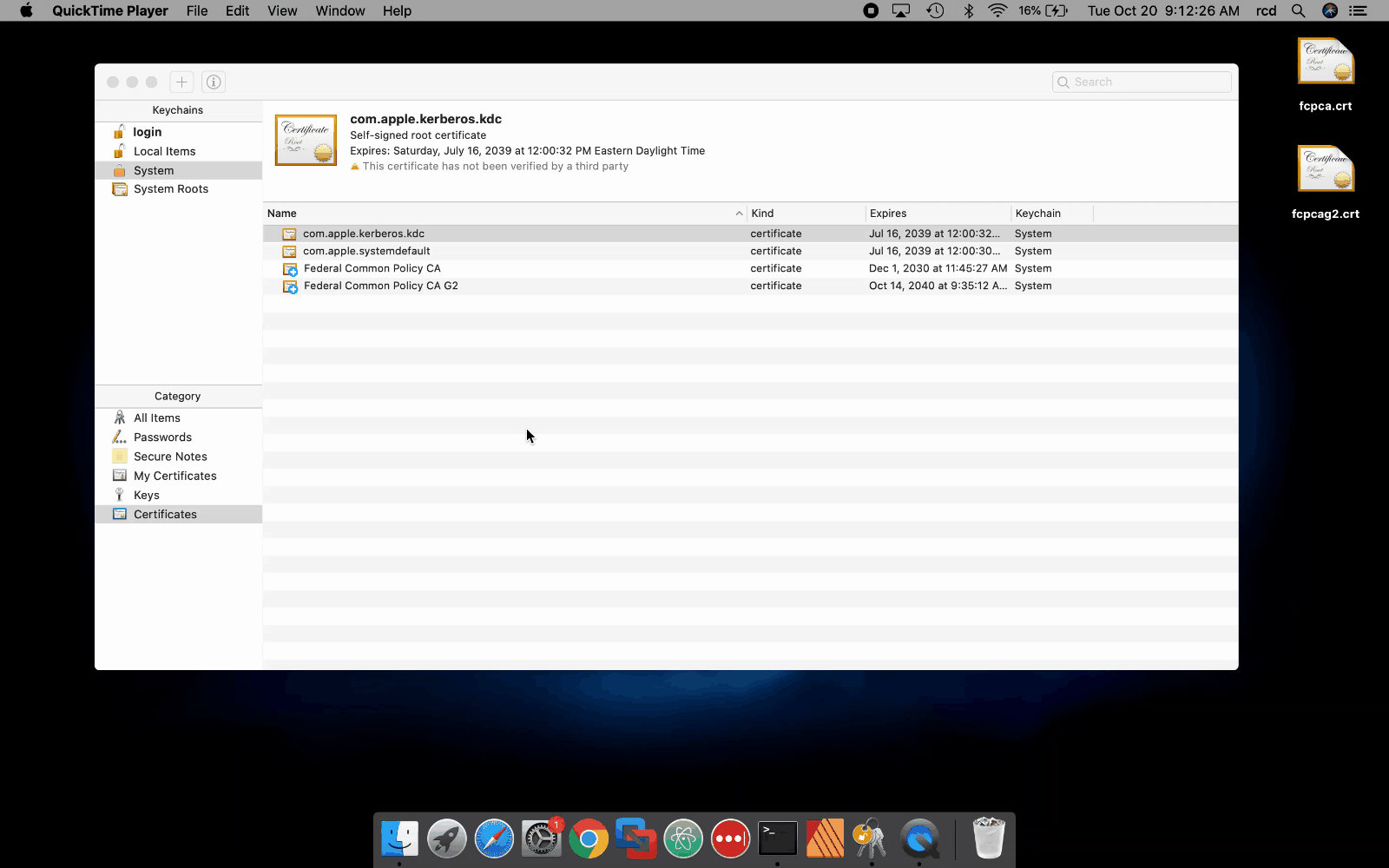 macOS handles certificate distrust differently than Windows does. The steps below distrust the FCPCA G1 certificate by deleting it from the System and Login Keychains. The absence of the FCPCA G1 certificate from the Keychains results in the certificate not being trusted by the workstation. Only system administrators should follow these steps.